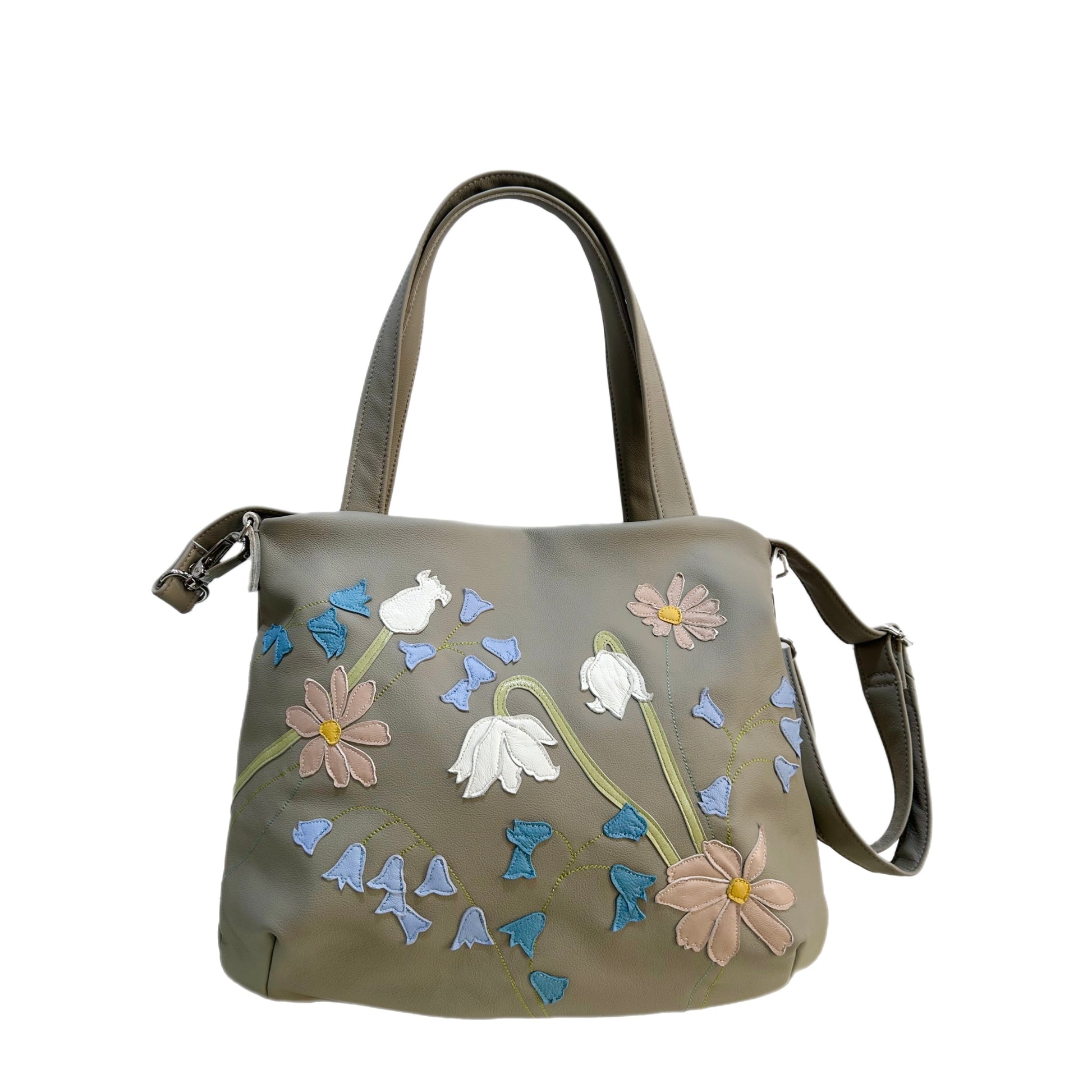 Appliquéd with a harmony of appliquéd aquilegea, cosmos and bluebells.